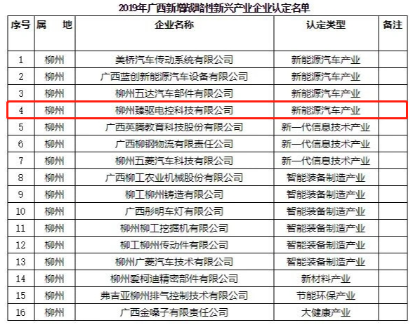 2020年5月,廣西壯族自治區(qū)新興產(chǎn)業(yè)發(fā)展辦公室發(fā)布了《關(guān)于公布2019年廣西新增戰(zhàn)略性新興產(chǎn)業(yè)企業(yè)認(rèn)定名單的通知》,認(rèn)定全區(qū)103家企業(yè)為2019年廣西新增戰(zhàn)略性新興產(chǎn)業(yè)企業(yè),作為電機控制器及其核心零部件產(chǎn)品研發(fā)、生產(chǎn)和銷售為一體的新能源動力總成核心零部件供應(yīng)商,柳州臻驅(qū)成功入圍該批戰(zhàn)略性新興企業(yè)認(rèn)定。