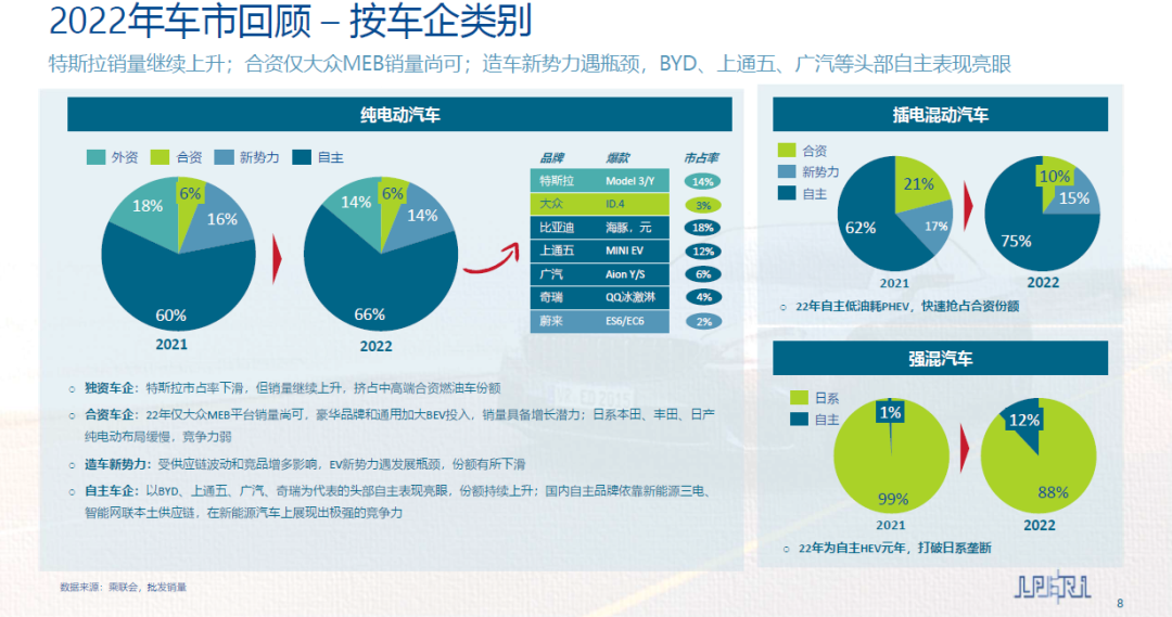 從BEV銷量來看,以特斯拉為代表的獨資車企雖然市場占有率下滑,但銷量繼續(xù)上升。合資車企中僅大眾MEB平臺銷量尚可。造車新勢力受到供應鏈波動和競品增多影響,遭遇發(fā)展瓶頸,份額有所下滑。以BYD、上通五、廣汽、奇瑞為代表的頭部自主品牌表現(xiàn)亮眼,份額持續(xù)上升。同時,自主品牌的低油耗PHEV新車型,搶占合資份額;另外,紛紛推出HEV車型,打破日系品牌的市場壟斷。