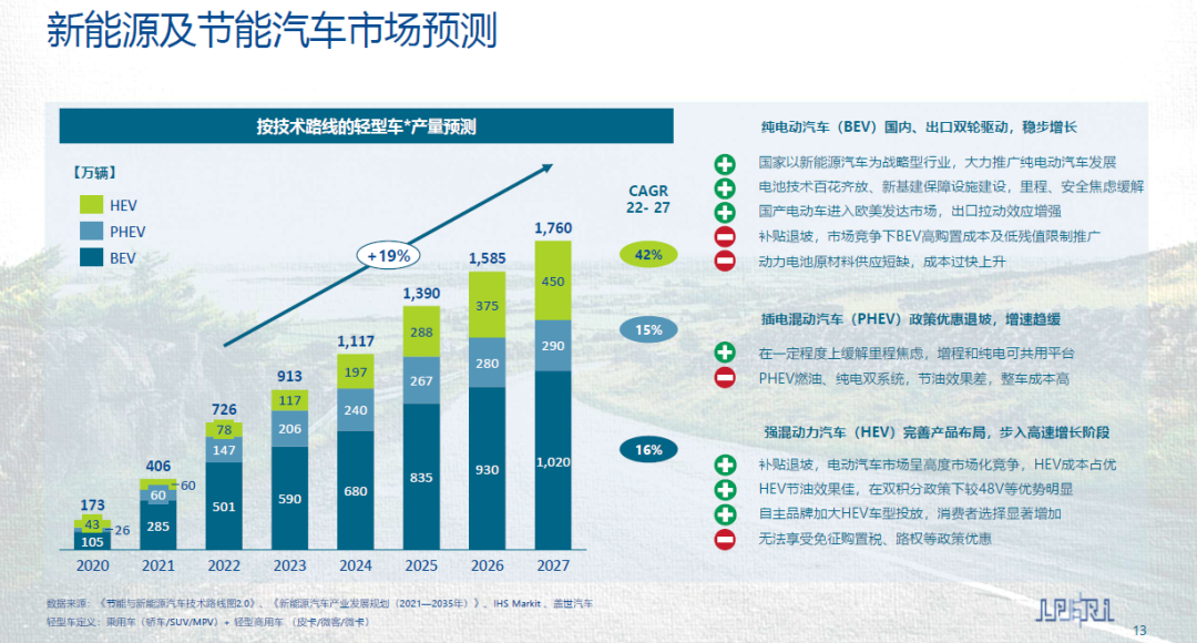 展望未來,中國新能源汽車銷量將持續(xù)增長,并在未來幾年率先步入千萬輛產(chǎn)銷的單一市場。從技術路線來看,BEV/PHEV/HEV三條技術路線將長期存在,相互競爭,均具備進一步增長的潛力。