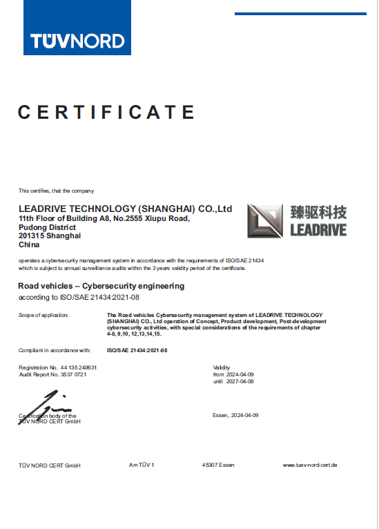 2024年5月11日,臻驅科技(上海)有限公司(以下簡稱“臻驅科技”)正式通過《ISO/SAE 21434道路車輛-網(wǎng)絡安全工程》(以下簡稱“ISO/SAE 21434”)汽車網(wǎng)絡安全管理體系認證,獲得此證書標志著臻驅科技已經(jīng)建立了完整的汽車網(wǎng)絡安全管理體系,具備了產品網(wǎng)絡安全開發(fā)和管理能力,是公司體系建設中又一關鍵里程碑。